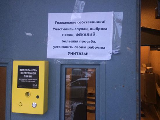 Как стало известно «МК», в частности, не так давно омерзительная картина предстала перед глазами обитателей микрорайона «Некрасовка-парк» на юго-востоке столицы. 17-этажный дом №2 на улице Ухтомского ополчения был сдан в декабре, и собственники квартир приступили к ремонту, наняв бригады. Не все сразу установили унитазы, поэтому рабочие стали решать деликатную проблему своим способом - выбрасывая отходы, помещенные в полиэтиленовый пакет, в окно. Мусор два раза обнаруживали дворники возле дома — явно, он вылетал из какой-то квартиры в первом подъезде. О находках доложили коменданту, тот сделал поквартирный обход, но никто в содеянном не признался. Дабы подействовать на нарушителей порядка, мужчина вывесил на подъезде объявление с просьбой установить в квартирах унитазы. Желаемый эффект был достигнут: больше подобные пакеты во дворе не появлялись.