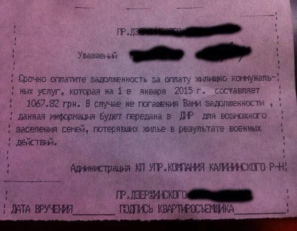 Оккупационная администрация Донецка рассылает жителям города письма с угрозами отобрать квартиры за коммунальные долги. При этом письма приходят даже тем, у кого уровень задолженности за коммунальные услуги совсем незначительный. Отобранное жилье авторы посланий обещают передавать семьям, потерявшим свои жилища в следствие военных действий.