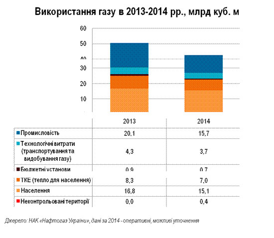 Приведенные выше объемы использования газа включают данные по АР Крым за 12 месяцев 2013 (1,7 млрд. куб. м) и 2 месяца 2014 (0,5 млрд. куб. м). Без учета этих данных использование газа на остальной территории Украины сократилось на 14%, в том числе по категориям потребителей: промышленность - на 15% до 16,1 млрд. куб. м, население - на 7% до 15,0 млрд. куб. м, предприятия ТКЭ - на 8% до 7,0 млрд. куб. м.