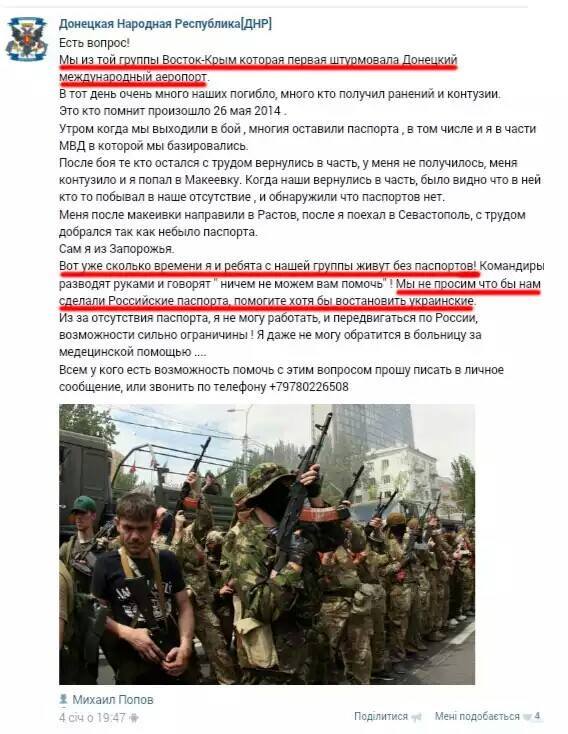 «Мы из той группы Восток-Крым, которая штурмовала Донецкий международный аэропорт. В тот день очень много наших погибло, много кто получил ранений и контузий. Это, кто помнит, произошло 26 мая 2014 год. Утром, когда мы выходили в бой, многие оставили паспорта, в том числе и я, в части МВД в которой мы базировались… «Вот уж сколько времени я и ребята из нашей группы живут без паспортов… Мы не просим, чтобы нам дали российские паспорта, помогите хотя бы восстановить украинские», — говорится в сообщении.