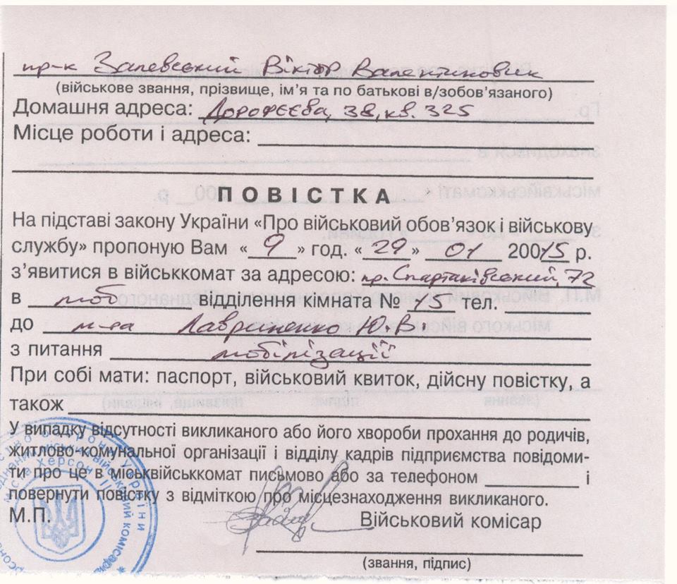 - повестка с предложением ("пропоную") явиться в военкомат для сверки учетной записи или собеседования;