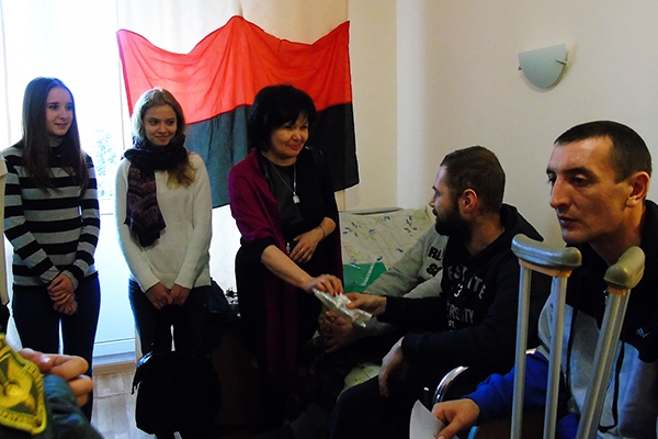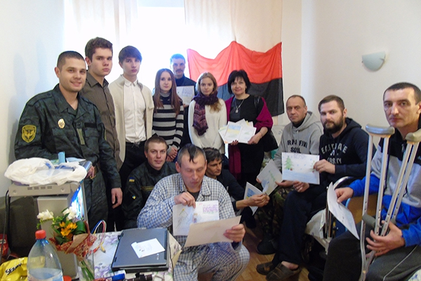 Ученики школы №263 имени Евгения Коновальца Деснянского района. Киев вместе с классным руководителем Светланой Заграйчук посетили Центральный госпиталь МВД, где находятся раненые военнослужащие. Среди пациентов есть те, которые пострадали в аварии, которая произошла 5 января в районе проведения АТО под Артемовском и унесла жизни 13 нацгвардейцев батальона оперативного назначения (резервистов) имени генерала Сергея Кульчицкого.
