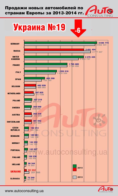Еще год назад украинский авторынок был 13-м по объемам продаж в Европе и был соизмерим с результатами Дании, Швеции и Польши. Однако во всех этих странах наблюдался рост продаж, в то время как в Украине зафиксирован спад на уровне -54,2%. В прошлом году Украина продемонстрировала беспрецедентный спад на европейском рынке. На втором месте была Россия, где авторынок сократился на 10,3%, - сообщает AUTO-Consulting. Там недосчитались продажи почти 286 тыс. автомобилей. Не смотря на это, Россия осталась на 2-м месте по объемам продаж новых автомобилей в Европе, но очевидно потеряет этот статус уже в 2015 году.