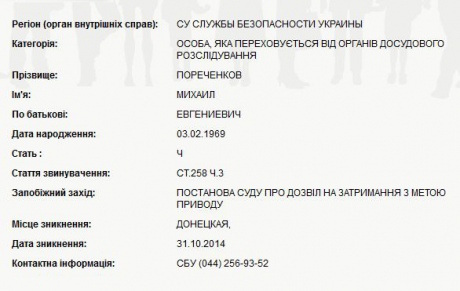 СБУ обозначило, что Пореченков исчез в Донецкой области 31 октября 2014 года.