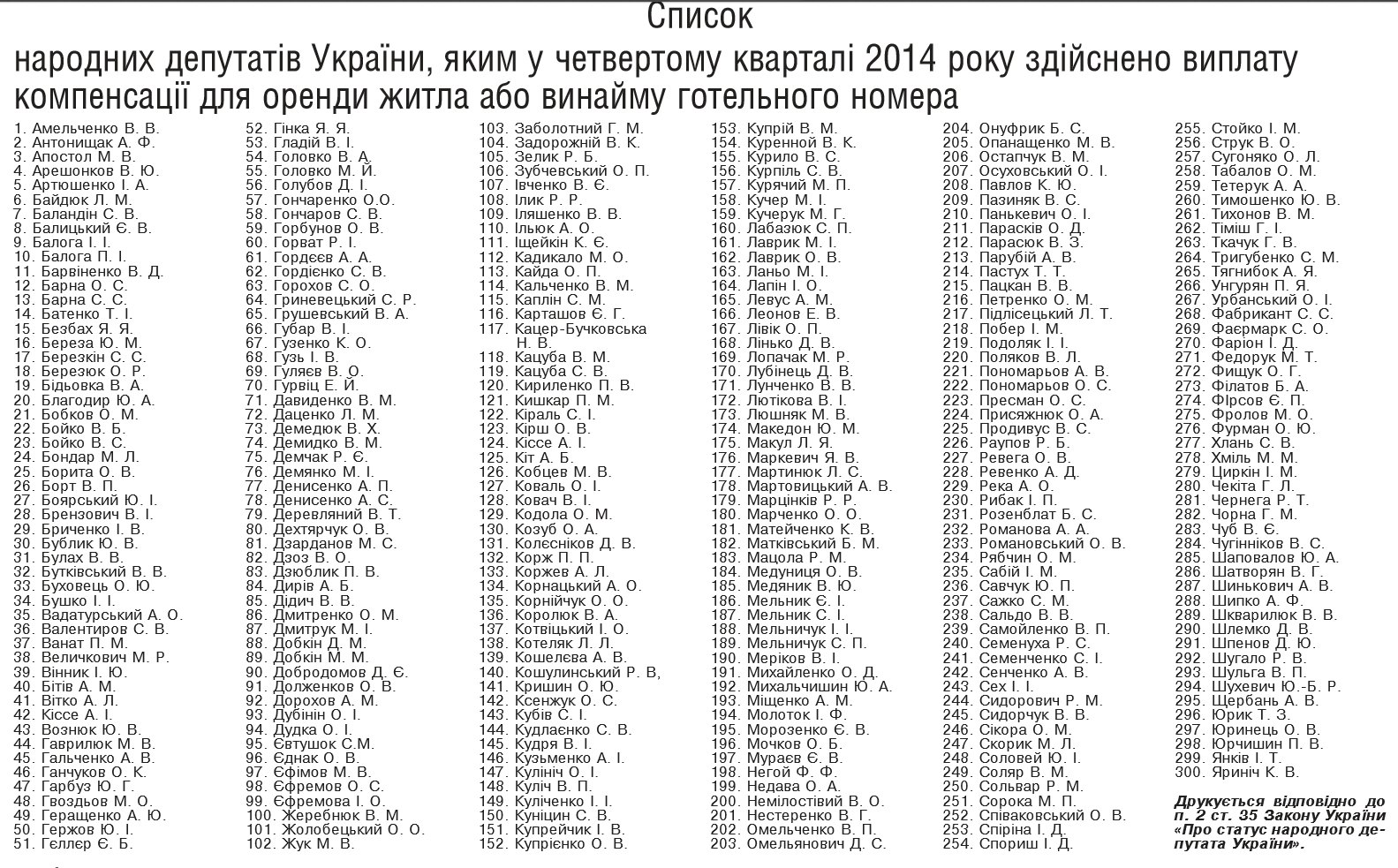 В четвертом квартале 2014 года компенсацию из государственного бюджета за проживание в Киеве получили 300 депутатов как действующего, так и прошлого созыва парламента.