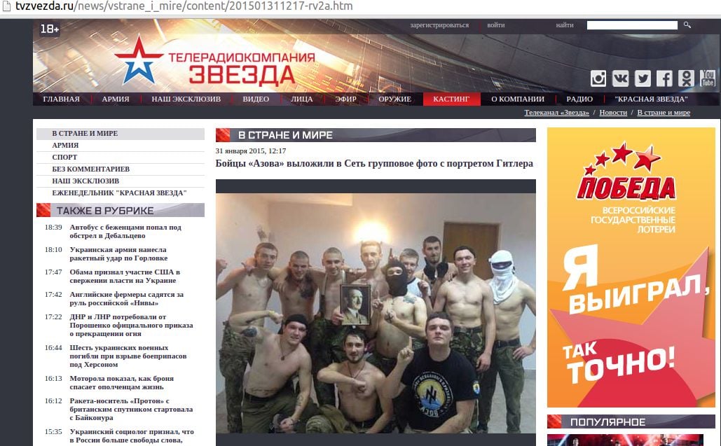 "Ну, вдруг случайно кто-то не видел: телеканал "Звезда" публикует у себя на сайте групповое фото якобы со страницы добровольческого батальона "Азов" в соцсети (какой - не указано, тега нет, адрес страницы - http://tvzvezda.ru/…/vstrane_…/content/201501311217-rv2a.htm) с портретом Гитлера. Ну а рядом - оригинал ночного дозора, только в лучшем качестве (понятно, что надо было сжать, чтобы скрыть фотошоп). Футболочка немножко другая. Ну и портрет соответственный. Кушайте, гости дорогие!"