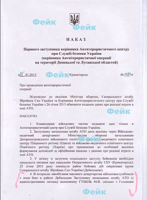 В интернете распространяется поддельный приказ первого заместителя руководителя Антиреррористического центра (АТЦ) при СБУ (Руководителя АТО в Луганской и Донецкой областях). В данном «документе» оговаривается создание «заградительных отрядов». «В интересах предотвращения массового дезертирства военнослужащих с поля боя в районе Дебальцево» заместителю начальника штаба АТО предписано «сформировать заградительные отряды из числа добровольческих батальонов». «Приказ» датирован 25 января.