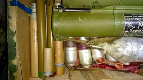 Из тайника сотрудники СБУ изъяли приведенные в боевую готовность гранатометы РПГ-18, около двух десятков гранат, дымовые шашки, цинк с патронами различного калибра. Также были обнаружены самодельные взрывные устройства, начиненные гвоздями и резаным проводом для усиления поражающих действия. Наряду с оружием в тайнике была скрыта агитационная продукция антиукраинского содержания, последний тираж газеты «Новороссия», флаги России и фейковой «Киевской народной республики».