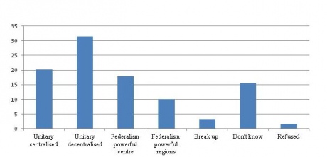 На вопрос, "Какой должна быть идеальная форма государственного правления в Украине" (график 1), большинство респондентов (32%) склоняются к унитарной формы правления, но с децентрализацией власти.