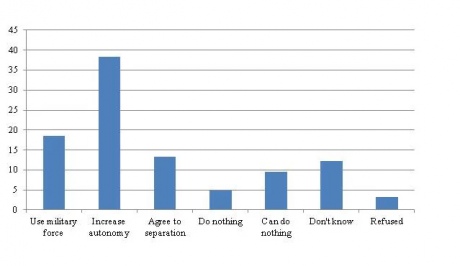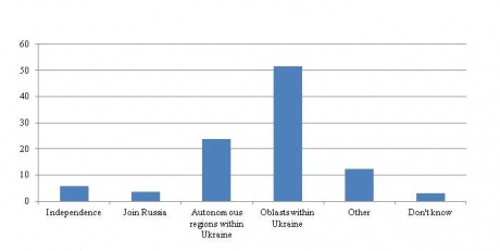 Отвечая на вопрос, как должно отреагировать правительство Украины на требования сепаратистов о Донбассе (график 3), только 13% респондентов согласны на отделение от Украины.