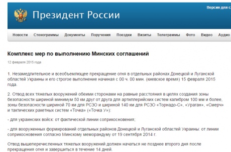 Вместе с тем на сайте президента РФ Владимира Путина размещен текст документа "Комплекс мер по выполнению Минск соглашений". В нем собственно упоминается данное тяжелое вооружение.