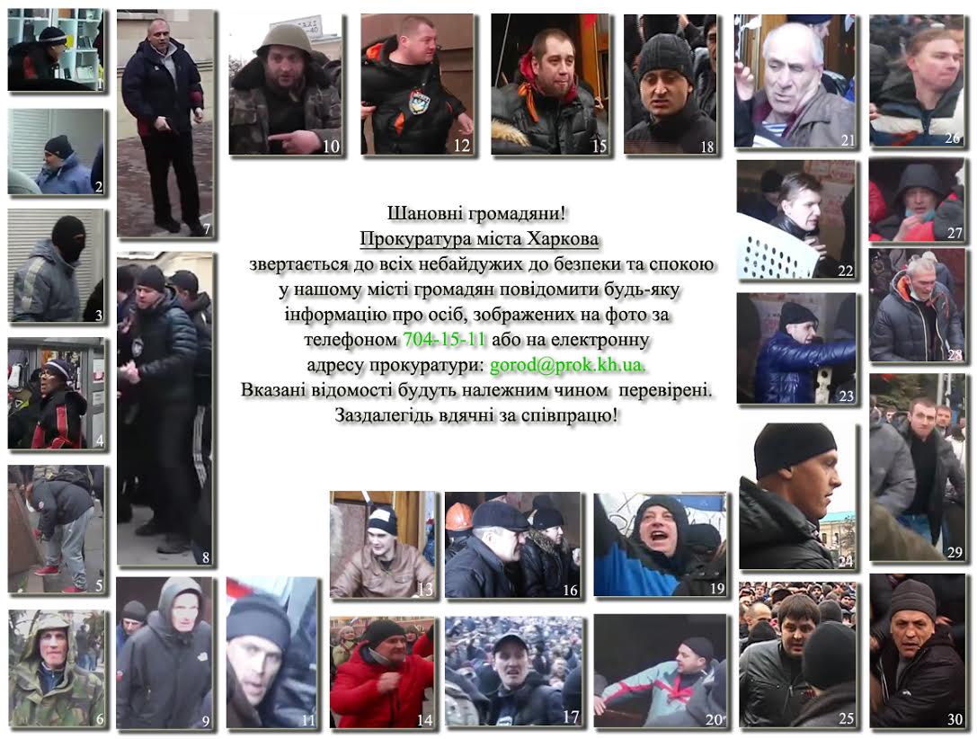 Прокуратура Харькова обращается к харьковчанам и жителям Украины с просьбой опознать людей, которые весной 2014 года устроили массовые беспорядки и провокации на харьковском Евромайдане. При этом, как отмечают в прокуратуре, действия антимайдановцев сопровождались насилием над людьми, уничтожением и порчей имущества, захватом зданий.