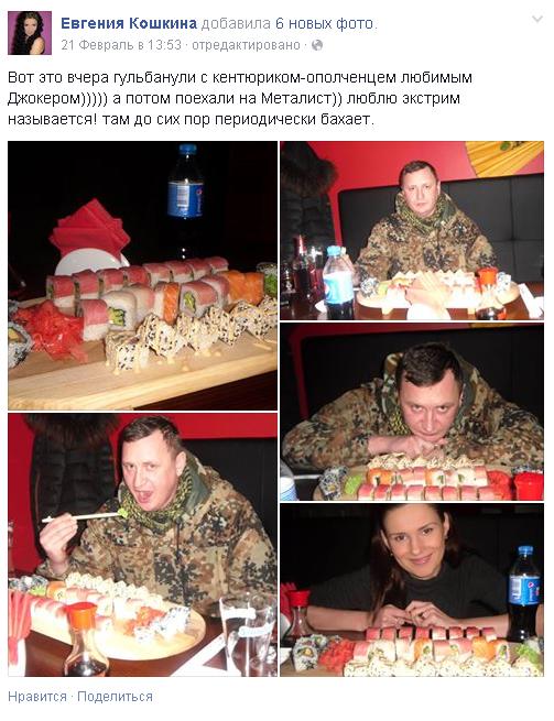 "В мирное время они обжирались шашлыками в день памяти людей, погибших от голода в 1932-33 гг, в военное - обжираются суши в голодающем, полупустом Луганске. Наша старая знакомая луганская коммунистка Женя Кошкина хвастается пиршеством в своем Facebook ", - пишет блогер.