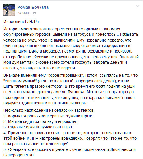 Житель Донбасса, побывавший в плену у луганских боевиков, после выхода на волю, сообщил о положении дел и настроениях внутри рядов боевиков «ЛНР». Из его рассказа стало известно, что задержанных кормят консервами из «гуманитарки». При этом многие сидят за пьянство и воровство. Также он отметил, что половина боевиков — россияне и к «ЛНР» они настроены враждебно. Говорят, что «это совсем не то, что нам рассказывали по телевизору». Обещают все бросить и уехать к себе после захвата Лисичанска и Северодонецка. Об этом пишет украинский журналист Роман Бочкала на своей странице в Фейсбук.