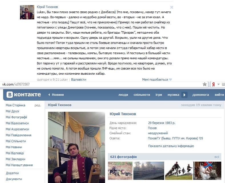 Юрий Тихонов - гражданин России. Житель Пскова. В свободное от работы время исполняет роль угнетенного донецкого шахтера, восставшего против гнета украинских националистов на Донбассе и воюет против украинцев в Дебальцево. Приехал убивать людей за тысячу километров от дома, пишет в своем ЖЖ Денис Казанский.