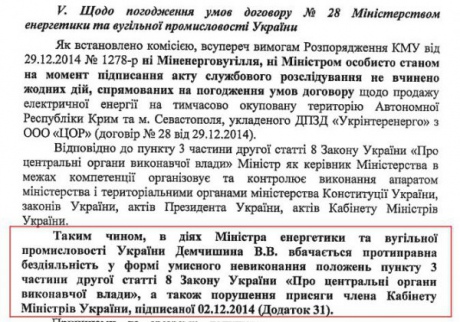 "Комиссия усматривает признаки заключения контрактов с многочисленными нарушениями требований действующего законодательства Украины, на заведомо невыгодных "Укринтерэнерго" условиях, несоответствие контрактов требованиям действующего законодательства по форме, содержанию и процедуре заключения", - говорится в приведенном документе.
