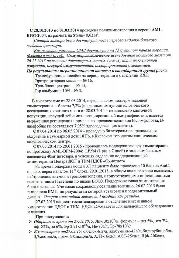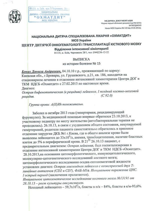 После очередных анализов ничего не подозревающий Даня и его семья были шокинованы результатами. Внешне абсолютно здоровый и активный ребенок, оказалось, вошел в рецидив.... Его госпитализировали и сразу начали блок высокодозной химии. Теперь заключение врачей неумолимо - операция нужна однозначно, да еще и от неродственного донора - никто из кровных родственников не подходит. Подобные операции делают только заграницей. Заключение только готовится к пересылке в клиники мира, но ориентировочные необходимые суммы уже известны - около 170 тыс. евро...