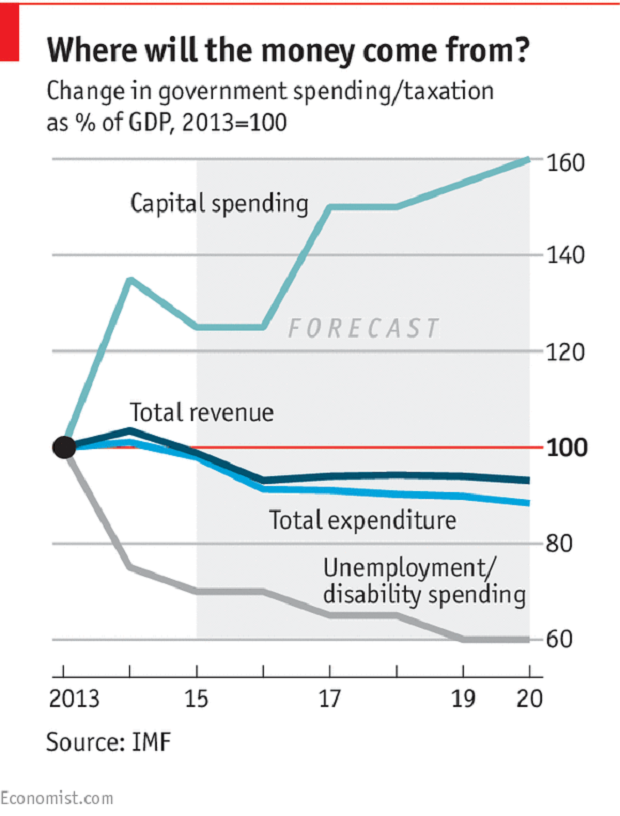 Что еще можно сделать, чтобы уменьшить дефицит? МВФ не хочет, чтобы налоги значительно увеличивались, но вместо этого ожидает сокращения расходов (смотрите второй график). Например, расходы на безработных и на страхование по инвалидности до 2017 г. должны сократиться примерно на 30% по сравнению с уровнем 2013 г. Это не очень хорошая новость, особенно учитывая то, что, по оценкам МВФ, уровень безработицы достигнет 11,5% в этом году (по сравнению с 7,3% в 2013 г.). Другими словами, у государства будет меньше денег для инвалидов и безработных.
