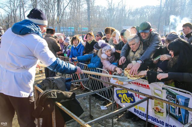 Как рассказывает «Юга.ру», полноценный блин не получился. Поэтому «повара» зачерпнули его куски снегоуборочными лопатами и раздали посетителям праздника.