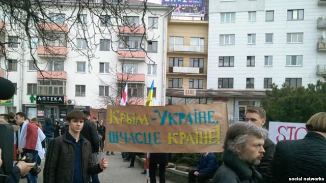 Как сообщает белорусская редакция Радыё Свабода, на шествие многие пришли с флагами Украины, участники несли плакат «Крым – Украине, счастье – стране».