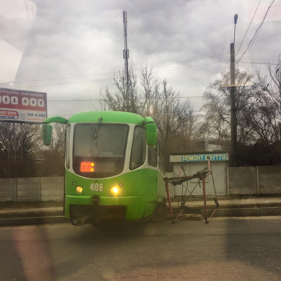 "Копилка" аварий с трамваями в Харькове постоянно пополняется. В субботу в районе развлекательного центра "Французский бульвар" вагон №4108 развернуло аж на 90 градусов. Так, что он стал поперек путей, да еще и с оторванным пантографом.