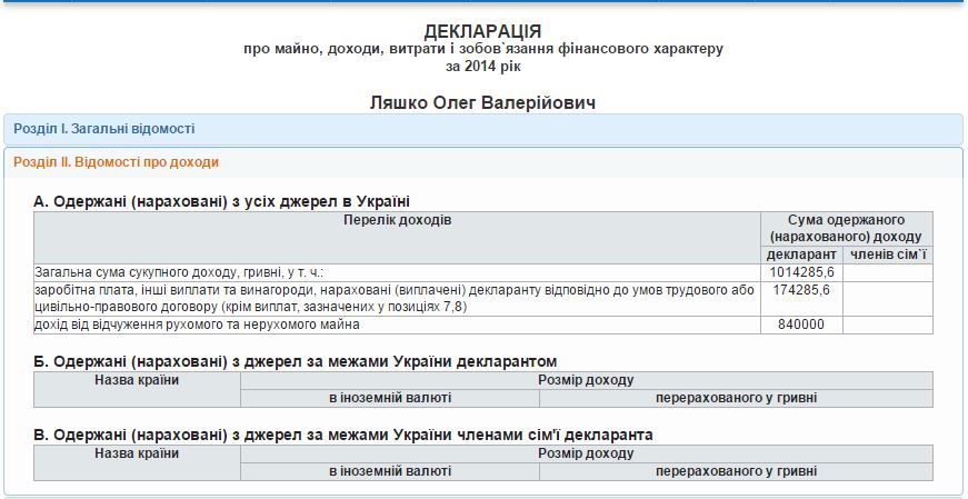 174 тысячи из этой суммы Ляшко получил как зарплату, а еще 840 тысяч от продажи имущества.