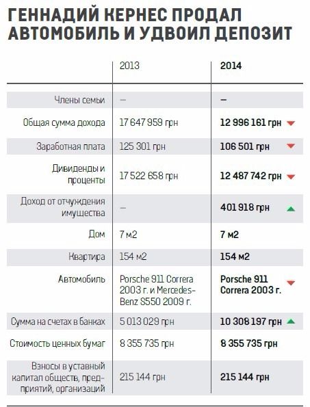 Банковские вклады Кернеса за год подросли почти в два раза и перевалили за 10 миллионов гривен. Деньги градоначальник держит в "Приватбанке" и "Регион-банке". Геннадий Кернес владеет ценными бумагами предприятий "Харьковоблэнерго", "Реал-Банка", "НПК-Холдинга", "РТМК Тонис-Центра". В графе "семья" у него по-прежнему стоит прочерк (дети у него все совершеннолетние).