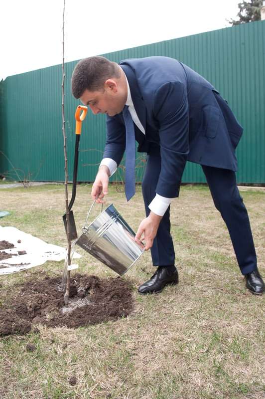Высадка деревьев спикерами Рады во внутреннем дворике здания Парламента по случаю Дня окружающей среды является парламентской традицией. Гройсман посадил яблоню сорта «Папирони».