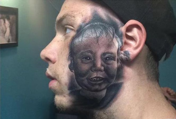 Секрист, впрочем, доволен собой и считает, что тату выглядит отлично, и сходство просто идеальное. Интересно, что на второй стороне лица у него уже есть тату с черепом и розой… так что второму ребенку Кристиена уже не достанется такая честь, как первенцу.