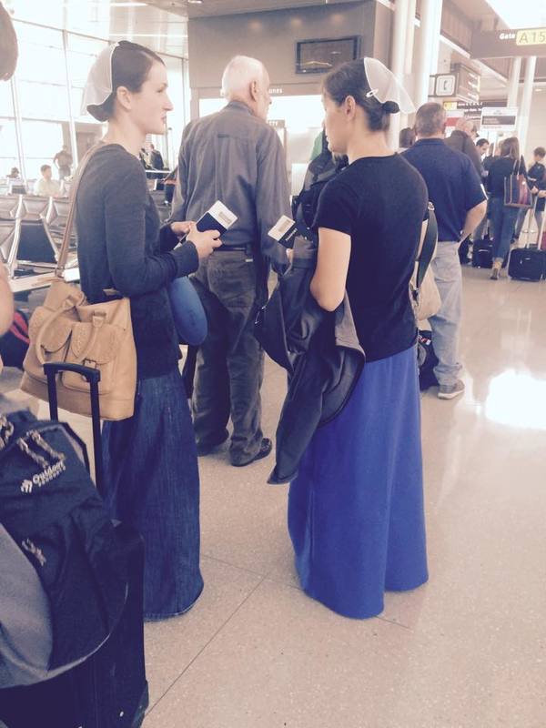 Сегодня ночью летел из Вашингтона в Амстердам (у меня там пересадка). И в очереди уже к самолету загляделся на двух молоденьких девушек, очень хорошеньких. Они были одеты совсем просто, в какие-то старомодные кофточки и длинные-предлинные бесформенные юбки, до самого полу. Лица с каким-то особенным, тоже очень спокойным и простым выражением, ни капли косметики, никаких украшений, даже уши не проколоты, волосы расчесаны аккуратным пробором и собраны на затылке в узел. А на макушке - прикрепленная тремя старомодными шпильками такая как бы салфеточка из полупрозрачной ткани. Намек на чепец...