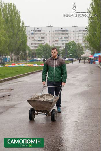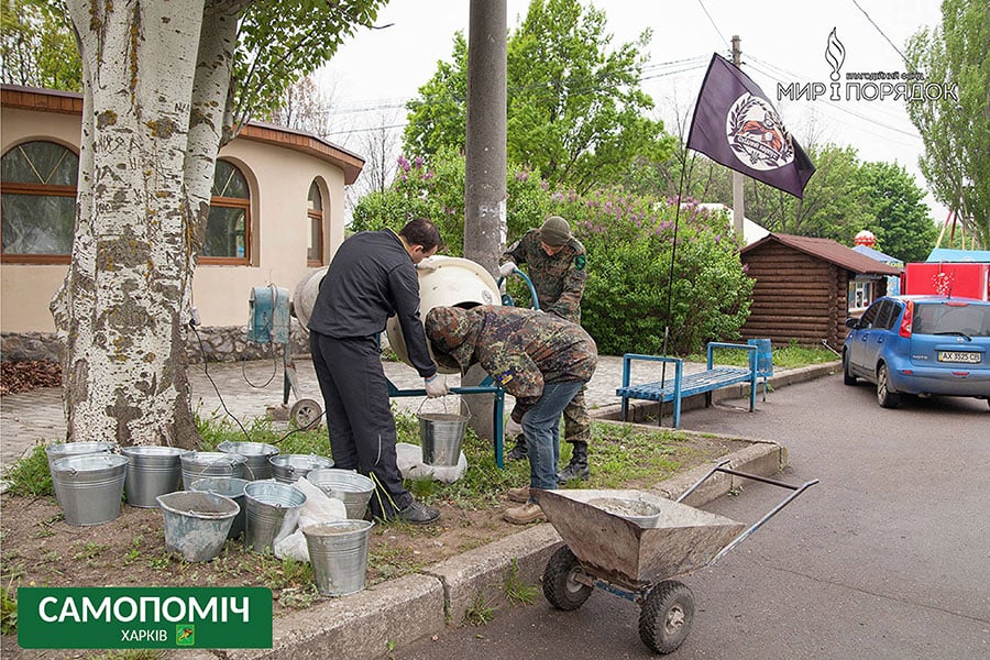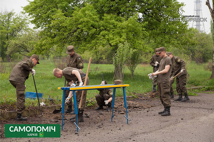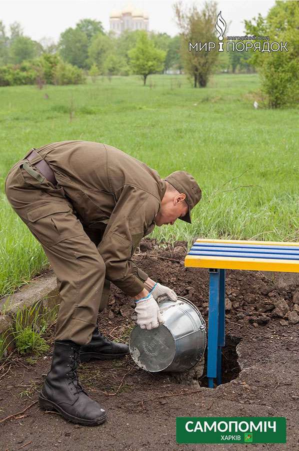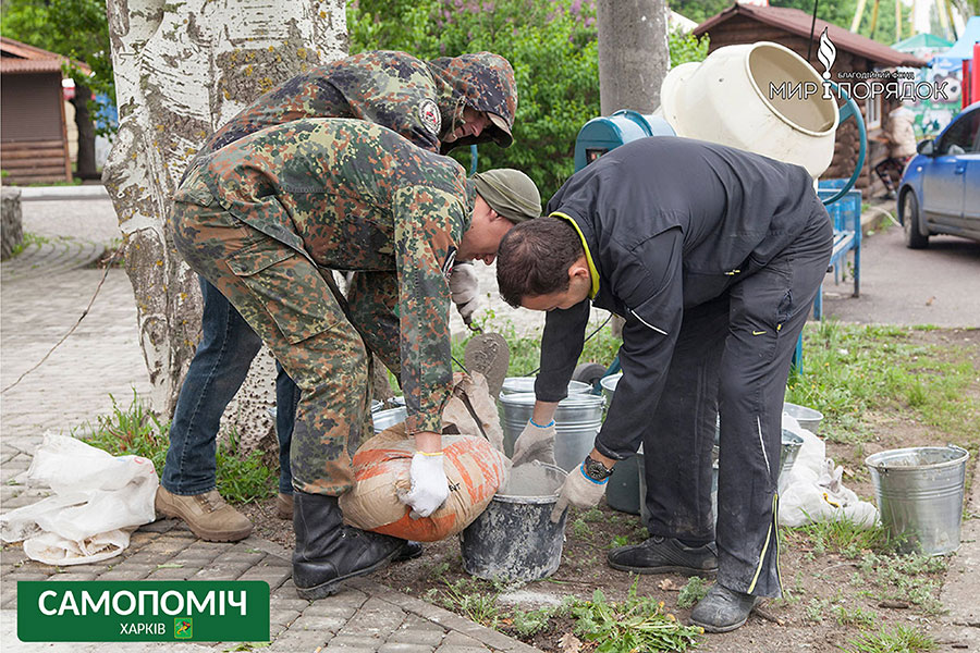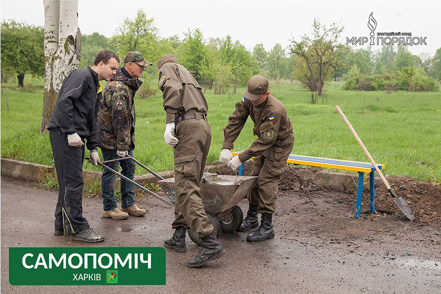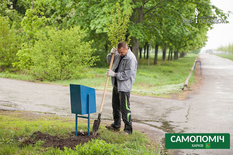 Чтобы справиться с тоннами накопившегося мусора на помощь харьковским коммунальным службам пришли волонтеры, благотворительные фонды, общественные организации. Накануне Дня Победы общественное объединение «Самопоміч» вместе с благотворительным фондом «Мир и порядок» в кратчайшие сроки осуществил установку в Парке Победы на Салтовке скамеек и урн.
