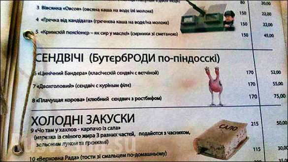 Цены в пабе довольно демократичные. Так, попробовать «Жаренных снегирей» (блюдо из перепелов) можно за 100 гривен. А «Вежливые люди» (лягушачьи лапки) стоят 90 гривен. Кроме того, в меню есть такие блюда, как «Ополченец гриль» (лосось), «Беркут гриль» (куриная грудка), «Циничный бандера» (классический сендвич с ветчиной) и десерт «Крымский пенсионер» (сырники со сметаной). Любители традиционной украинской кухни могут попробовать «Что там у хохлов» (тарелка с салом, чесноком и гренками ). Цены в меню не превышают 200 гривен.