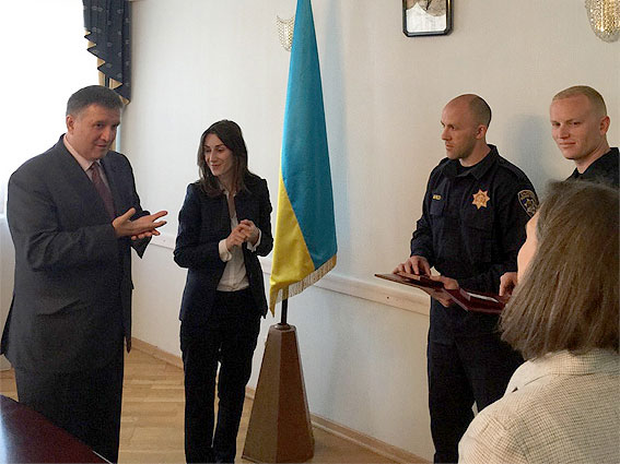 Заместитель Госсекретаря США Виктория Нуланд и Министр внутренних дел Украины Арсен Аваков от имени Правительства Украины вручили двум полицейским из Калифорнии медали и Почетные грамоты Кабинета Министров. Иностранные специалисты были награждены за тесное сотрудничество с правоохранительными органами Украины в подготовке профессиональных инструкторов для новой украинской полиции.