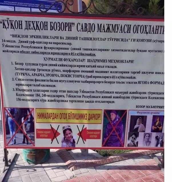 В городе Коканде в Ферганской области местные власти разместили баннеры у ворот базара с предупреждением женщинам не носить на территории рынка хиджабы в "арабских, иранских, турецких или пакистанских стилях", пишет Узбекская служба Радио Свободы (Озодлик).