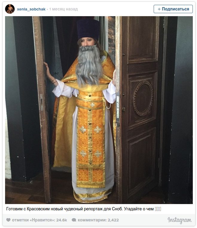 Глава синодального Отдела по взаимоотношениям Церкви и общества протоиерей Всеволод Чаплин посчитал осквернением святыни фотографию из инстаграма телеведущей Ксении Собчак в одежде православного священника, передает «Интерфакс».