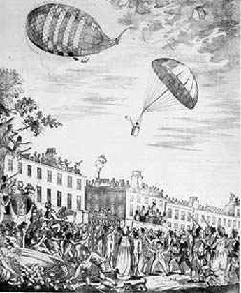 В 1785 году в Лондоне французский воздухоплаватель Франсуа Бланшар продемонстрировал сконструированный им парашют - с воздушного шара на высоте 300 м он скинул собаку с закреплённым изобретением, и она успешно приземлилась.