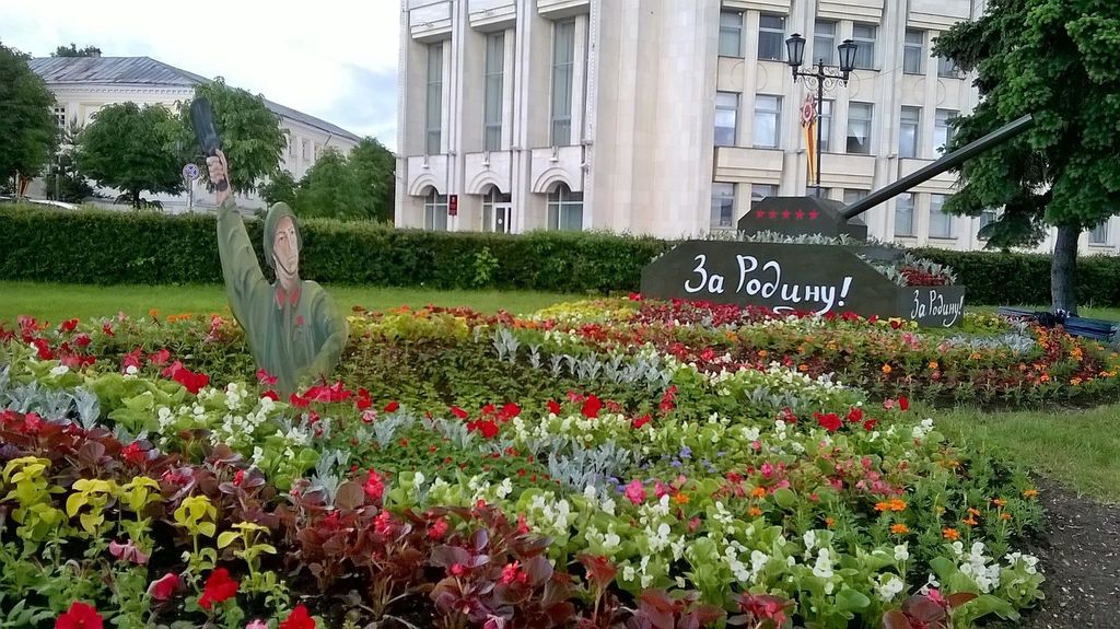 Из клумбы выпрыгивает солдат в советской военной форме - в руке он держит гранату. При этом сзади установлен макет танка с надписью "За Родину!".