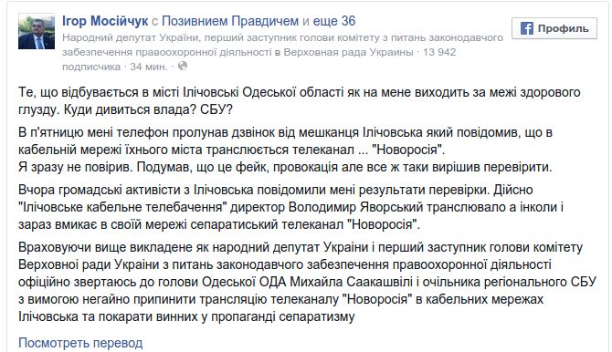 "В пятницу на мой телефон раздался звонок от жителя Ильичевска, который сообщил, что в кабельной сети города транслируется телеканал "Новороссия". Я сразу не поверил. Подумал, что это фейк, провокация, но все же решил проверить. Вчера общественные активисты из Ильичевска сообщили мне результаты проверки. Действительно "Ильичевске кабельное телевидение", директор Владимир Яворский, транслировало, а иногда и сейчас включает в своей сети сепаратистский телеканал "Новороссия", - написал он.