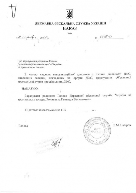 Председатель Государственной фискальной службы Роман Насиров назначил своим советником Геннадия Романенко, кума Игоря Калетника - главы таможни за Януковича и экс-вице-спикера Рады, который сыграл значительную роль в принятии диктаторских законов 16 января.