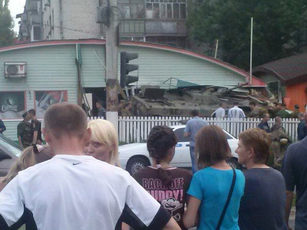БМП двигалась по улице Смоленская. Сообщается, что водитель не справился с управлением и въехал в кафе, где находились люди.