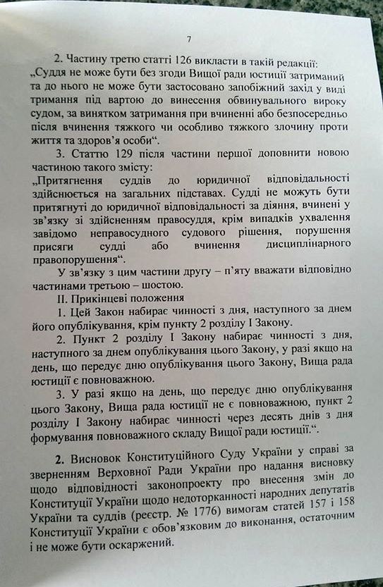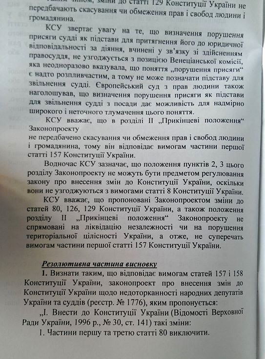 "Признать отвечающим требованиям статей 157 и 158 Конституции Украины законопроект о внесении изменений в Конституцию Украины относительно неприкосновенности народных депутатов Украины и судей", - говорится в сообщении.