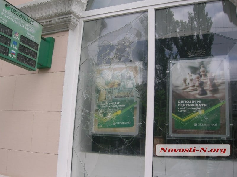 В ночь с пятницы на субботу в Николаеве неизвестные забросали бутылками отделение «Сбербанка России», расположенное на проспекте Ленина, в районе Центрального рынка.