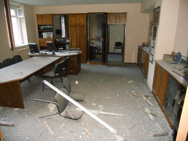 Вследствие выстрела выбиты окно, повреждены металлический фасад и частично служебный кабинет.