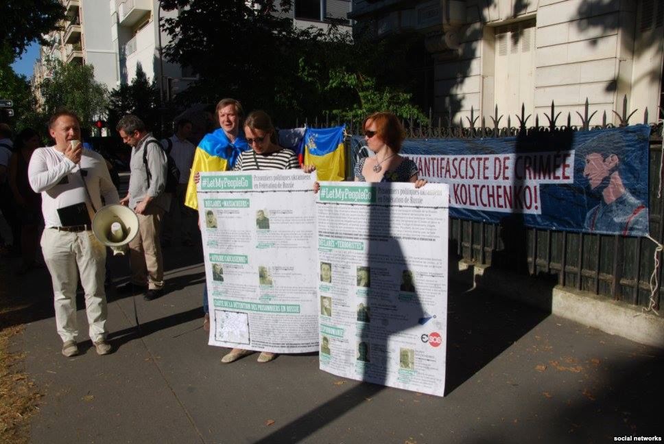 В Париже 30 июня перед российским посольством прошла акция протеста, участники которой требовали освободить «крымских заложников» Александра Кольченко и Олега Сенцова, а также других политзаключенных, содержащихся в тюрьмах в Российской Федерации.