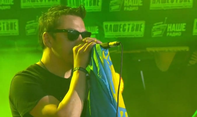 На фестивале «Нашествие-2015» в Большом Завидово Тверской области лидер группы «Танцы Минус» Вячеслав Петкун развернул на сцене желто-голубой флаг.