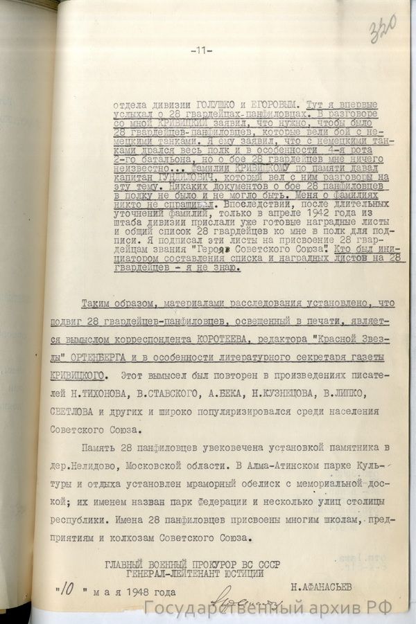 "Таким образом, материалами расследования установлено, что подвиг 28 гвардейцев-панфиловцев, освещенный в печати, является вымыслом корреспондента Коротеева, редактора "Красной Звезды" Ортенберга и в особенности литературного секретаря газеты Кривицкого", - говорится в докладе.
