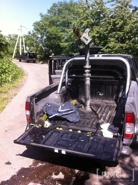 На машинах видны пулевые отверстия и пробитые колеса, а в багажнике пикапа - противотанковые гранатометы типа "Муха". Снимки были сделаны местным интернет-изданием pmg.ua.