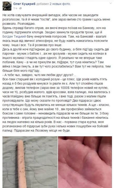 "Где-то в два часа ночи подъезжаю к своему дому, а у подъезда сидят две парочки – мужик с бабой и, даже не понял – мужик сидит на коленях у другого мужика и гладят друг друга. Я реально впервые в жизни такое увидел. Сказал – а не при...ли ли вы п..ры, тут с...ка нежиться? Там война и люди гибнут, а вы тут чего расслабились? Вам тут не гейропа, тем более, возле моего подъезда", – написал Куцериб.