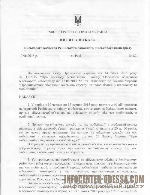 Данный документ появился на сайте районной администрации. Согласно приказу военкома Игоря Скрыпника в период с 19 июня по 17 августа, военнообязанные мужчины возрастом от 20 до 60 лет, обязаны явиться в военкомат. Более того, подходящие по возрасту призывники, даже не имея на руках повестки - также должны прийти в военкомат с документами на руках.