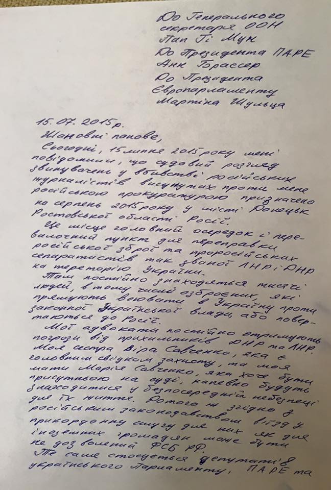 Она просит содействовать в переносе судебного разбирательства в Москву. "Прошу вас обратиться к руководству России с настоятельной просьбой об обеспечении нормальных и безопасных условий судебного разбирательства, а в частности, о переносе рассмотрения в суд в городе Москва", – завершает письмо Савченко.